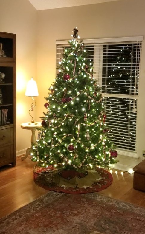 Fast forward three years: Dec 2020. Already a crappy year. The flocked, pre-lit tree stands in one corner of the living room. Two weeks into the season, three weeks to go until Christmas. Limbs fluffed, fully decorated with a slew of ornaments collected over forty years, and wrapped in popcorn-cranberry garland — though Linda has to squint to find the latter amongst all of that blamed flocking.